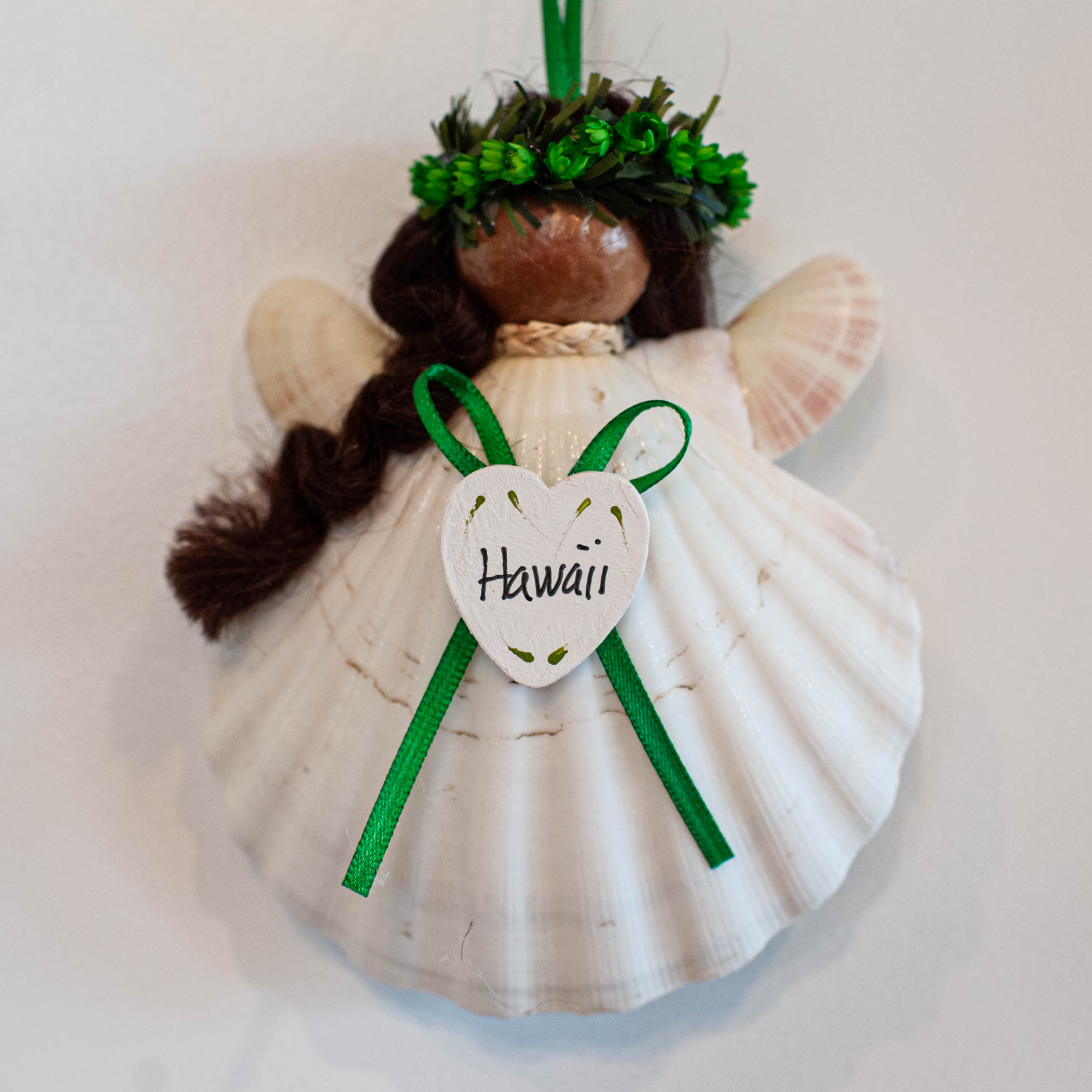 This hanging Angel Body (4.5″ x 5″) is made from a Calico Scallop Shell and is given flight with itÊ»s Tellina shell wings. The head is a macadamia nut with long brown wool hair laid across the front, an Emerald Green Brazilian Star Flower Haku Lei placed on top, and a braided raffia trim around the neck. This Angel is also holding a heart inscribed with either the word Hawaii, Kauai, Maui, Oahu, Aloha or another short person name/phrase.