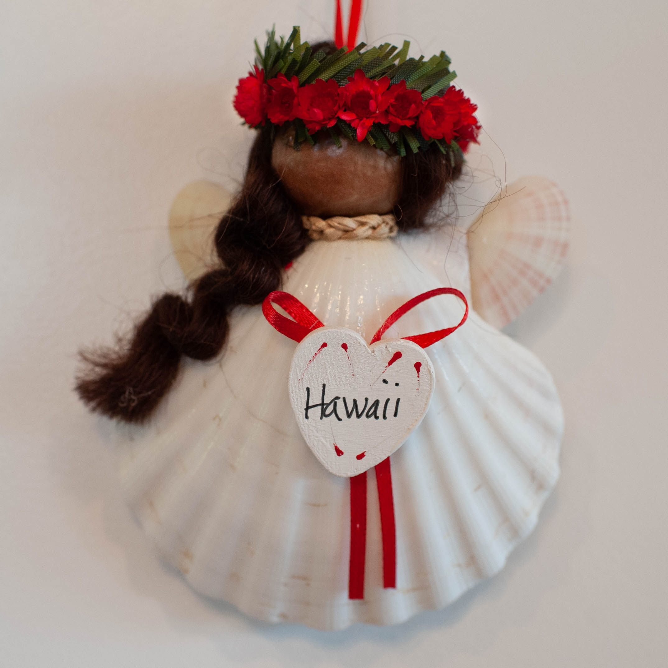 This hanging Angel Body (4.5″ x 4″) is made from a Calico Scallop Shell and is given flight with itÊ»s Tellina shell wings. The head is a macadamia nut with long brown wool hair laid across the front, a Red Brazilian Star Flower Haku Lei placed on top, and a braided raffia trim around the neck. This Angel is also holding a heart inscribed with either the word Hawaii, Kauai, Maui, Oahu, Aloha or another short person name/phrase.
